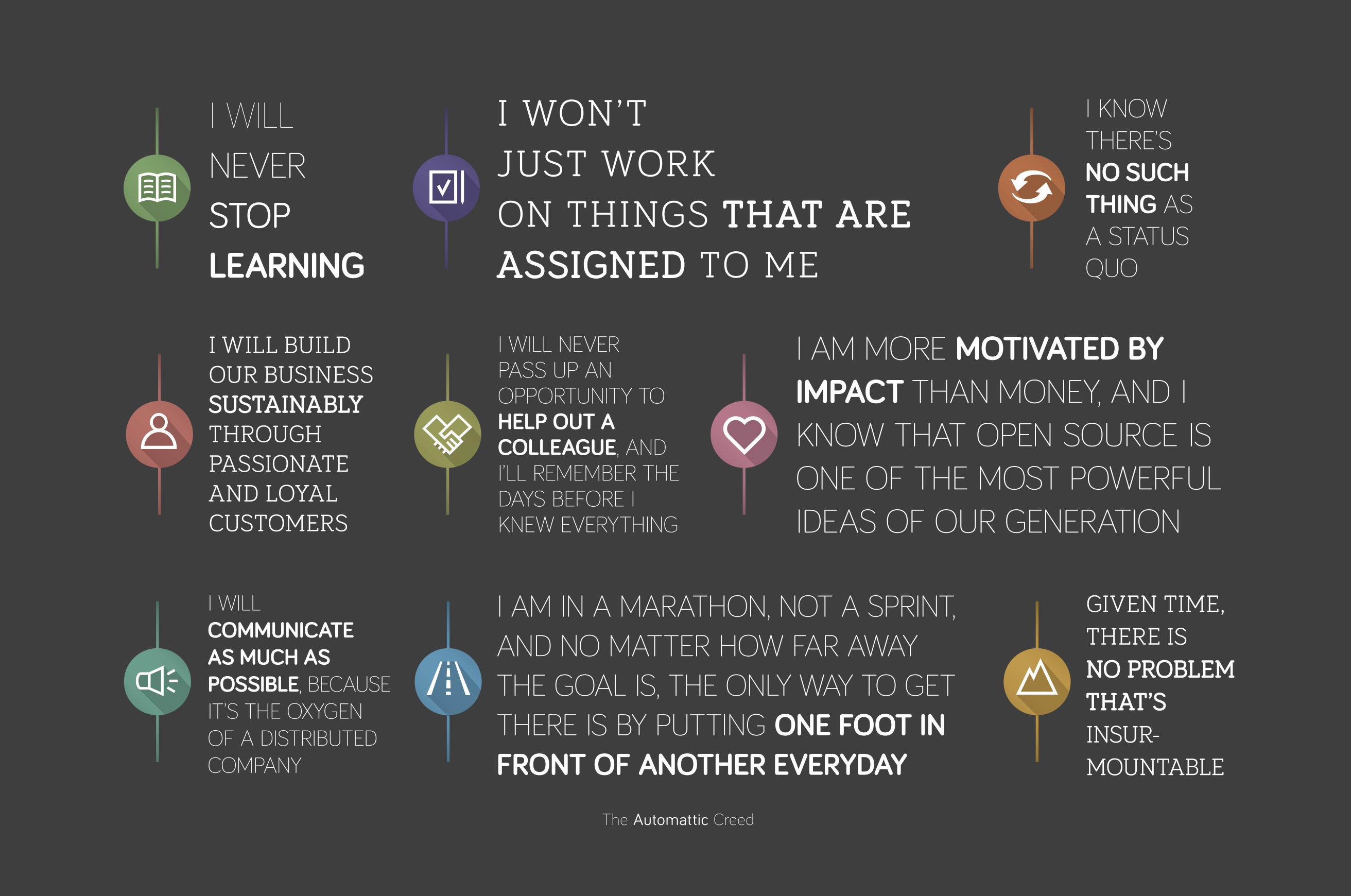 Esto significa que ya no voy a poder seguir trabajando con esas maravillosas personas humanas que son Fran, Roberto y Xelo, es decir, GIGA4.Mi ultimo Appear.in de GIGA4 Tengo un poco partío el corazón y voy a echar de menos trabajar con ellos, pero estoy convencido de que a GIGA4 le va a ir muy bien… sobre todo ahora que se han librado de mi 😛 El caso es que ahora empieza tierra ignota y un mundo muy distinto para mi, que llevaba 10 años trabajando por mi cuenta y estaba acostumbrado a hacer simpre las cosas a mi manera. Sé que algunas cosas no van a ser fáciles, pero también tengo ganas de cambiar de aires y forzarme a salir de mi zona de confort.En mi nueva empresa vamos a ser alguno más (Foto de empresa de Automattic en 2017) Trabajar en Automattic supone una grandísima oportunidad profesional, tanto por todo lo que voy aprender como por toda la gente nueva que estoy conociendo. Un de las cosas que más me motiva es que voy a poder dejar de lado las (muchas) cosas en las que soy absolutamente mediocre: negociar presupuestos, gestionar proyectos, administrar sistemas o escribir código y me voy a poder concentrar en lo que mejor se me da: resolver problemas y enseñar a la gente a usar WordPress.Automattic, la empresa sin oficina central. Y por si esto fuera poco lo voy a hacer siendo parte de una empresa con la que comparto los mismos valores: una sociedad diversa y abierta, el código libre y una internet libre.Credo de Automattic Quiero aprovechar para mandar un saludo y quitarme el sombrero por toda la comunidad WordPress, especialmente la española. Está llena de gente con un talento y una generosidad inmensos. Sin su ayuda contribuyendo a WordPress y organizando WordCamps seguramente yo hoy no estaría dando este paso así que gracias, gracias y gracias. Finalmente si estáis leyendo y alguna vez habéis pensado en postularos para trabajar en Automattic mi consejo es que lo dejéis de pensar y os animéis a hacerlo 😀
