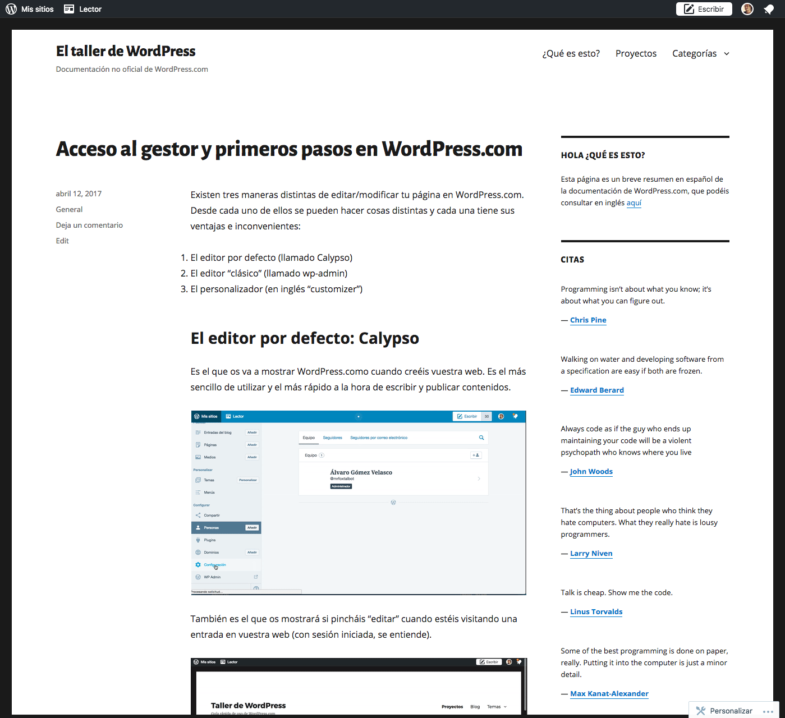 El objetivo del curso era poder montar un pequeño portfolio de trabajos tanto para los profesores como para que estos a su vez enseñaran a sus alumnos para hacerlo. Al tratarse de perfiles poco técnicos basamos el curso en WordPress.com y a modo de ejemplo yo monté mi propio blog donde fui añadiendo los contenidos del curso: https://eltallerde.wordpress.com/